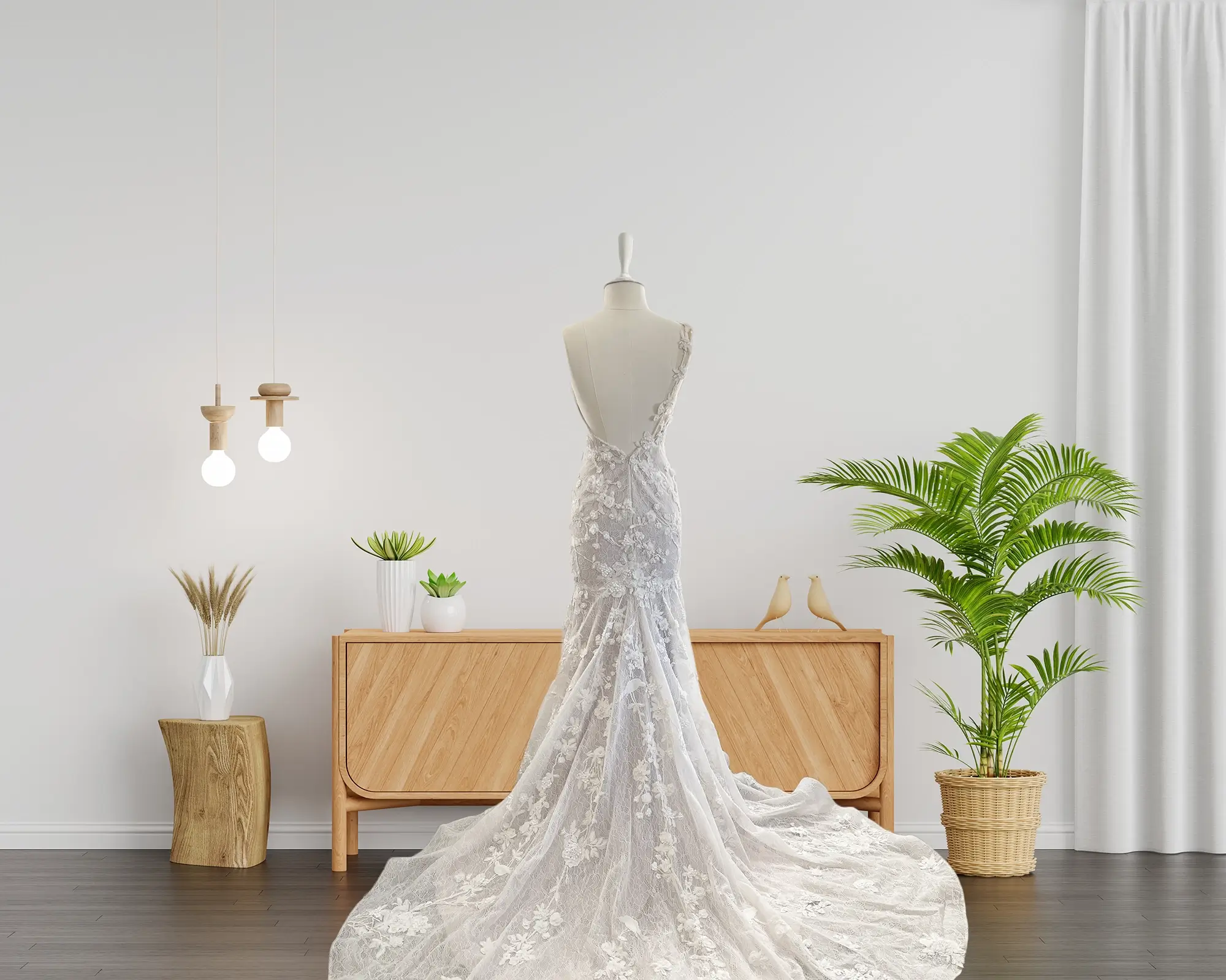 This stunning mermaid wedding gown features a special design with intricate 3D lace detailing on the bodice and skirt, creating a beautiful and unique texture. The dress also boasts a long train for a dramatic effect and an asymmetrical one-shoulder design that is both modern and elegant. The lace-covered shoulder adds a romantic touch to the overall look, while the fitted silhouette of the dress accentuates the natural curves of the body. Perfect for the bride who wants a statement-making dress that is both timeless and modern.