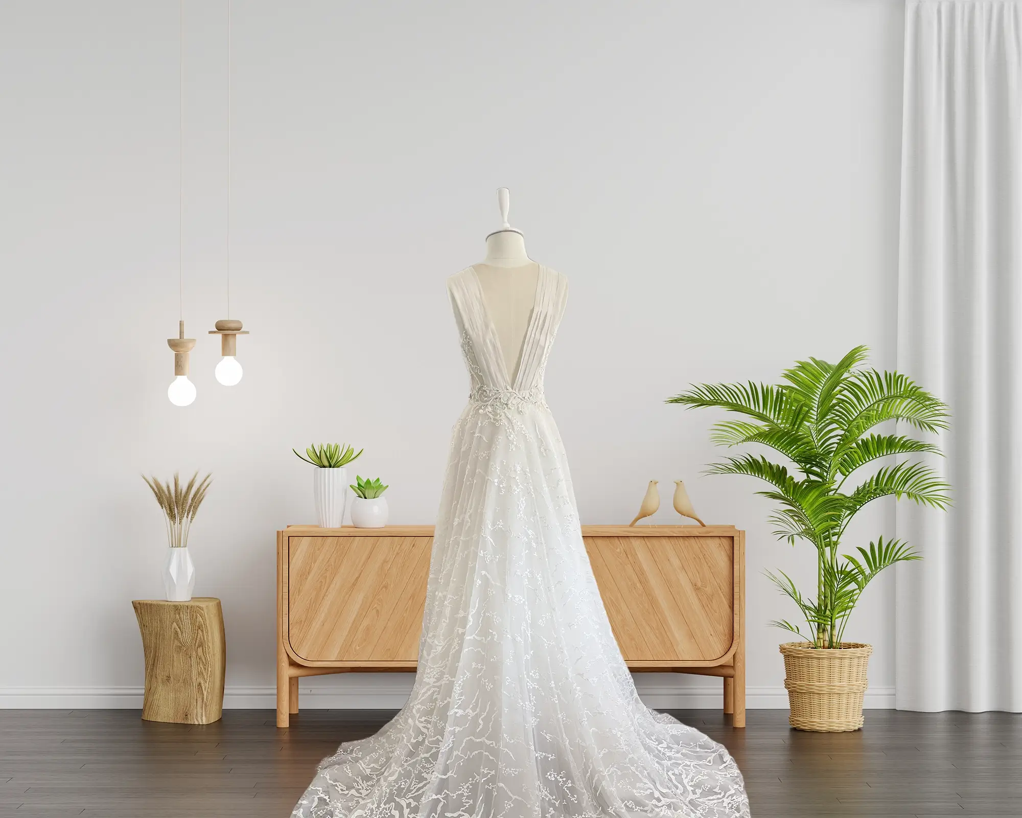 This custom design wedding dress is truly one-of-a-kind, with unique design elements that are sure to turn heads on your special day. The dress features a flattering V-neckline, which is accented by beautiful organza draping that adds a touch of drama and sophistication. The full lace skirt is straight down and adds a classic elegance to the overall silhouette. The dress has been handcrafted with the highest quality materials, ensuring a flawless fit and feel. Whether you’re walking down the aisle in a grand cathedral or saying “I do” in an intimate outdoor setting, this stunning wedding dress is sure to make you feel like the most beautiful bride in the world. With its combination of elegant design elements, luxurious fabrics, and timeless style, this dress is a true work of art that you’ll treasure for years to come.